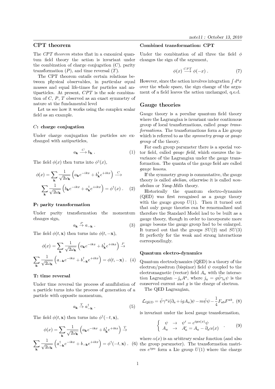 CPT symmetry. Gauge theories: QED; Yang-Mills (non-abelian) theories.
