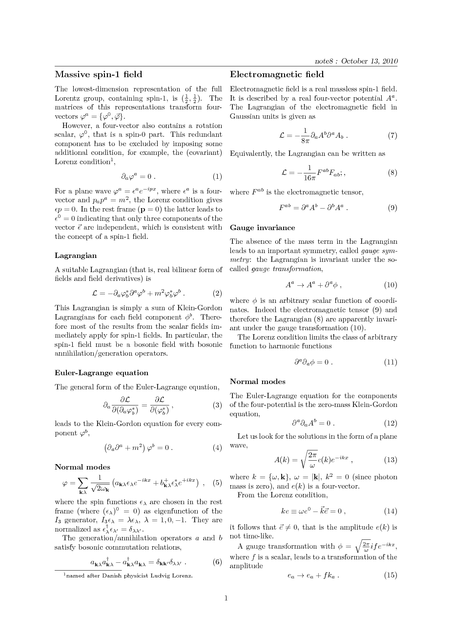 Massive spin-1 field, Lorenz condition; Electromagnetic field, gauge