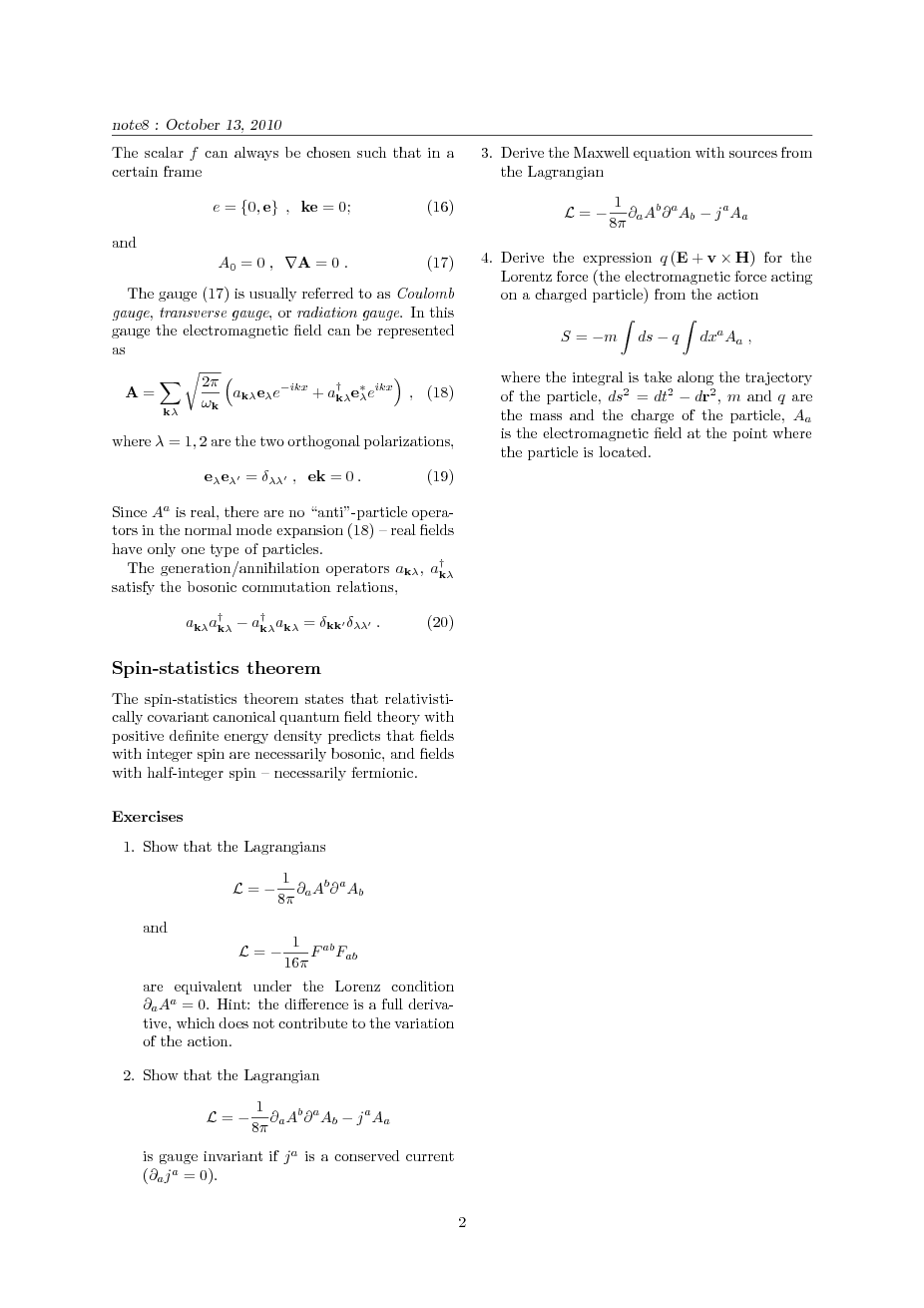 invariance, quantization in radiation gauge; Spin-statistics theorem.